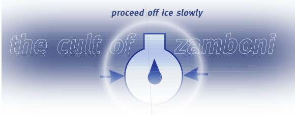 Watching the Zamboni brings out the rugged individualist. The machine is the ultimate off-road sport utility vehicle. It shaves, it cleans, it leaves a glossy finish, it grabs attention. It manages to retain an aura of mystery. The Zamboni has inspired key chains, license plates that read "My other car is a Zamboni" and song. David Letterman mentioned it in a Top Ten list and has driven an ice resurfacer for his show. A growing number of artists use it as a muse, including cartoonist Charles Schulz. Martin Zeller, former lead singer of The Gear Daddies, penned the now infamous "Zamboni" song; this version is performed by the masters of niche marketing (in the category of...hockey music?), The Zambonis. The Zambonis has reached cult status. The band played in Denver, supporting the Avalanche during the 1997 Stanley Cup semi-finals. Their music and appearances live on. The audio excerpt of "The Great Zamboni of Devotion" is a song from The Zambonis' album, "Play-Off Fever." |
